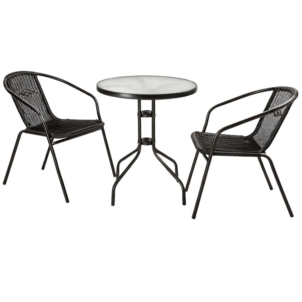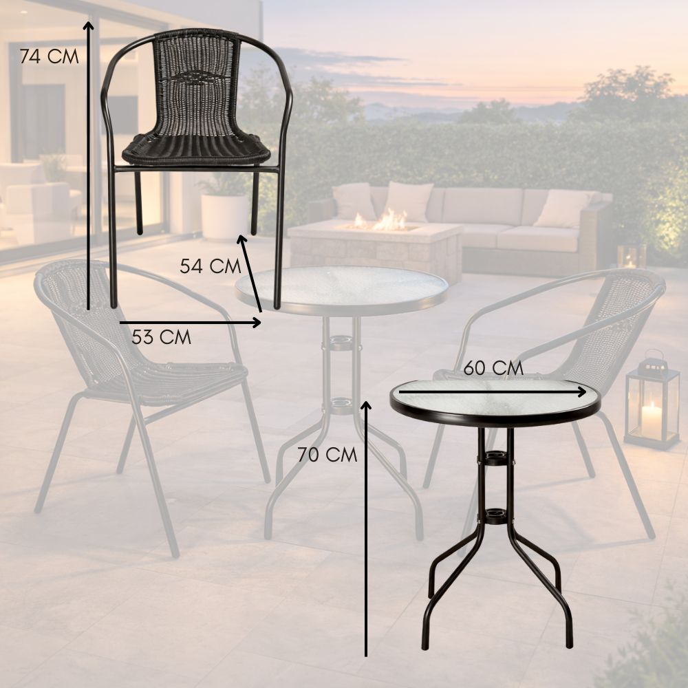 Set 2 posti completo di tavolo rotondo con ripiano in vetro temperato, elegante e facile da pulire, poltrone impilabili con braccioli, struttura in metallo e schienale e seduta in polyrattan: elementi che garantiscono comfort e resistenza.