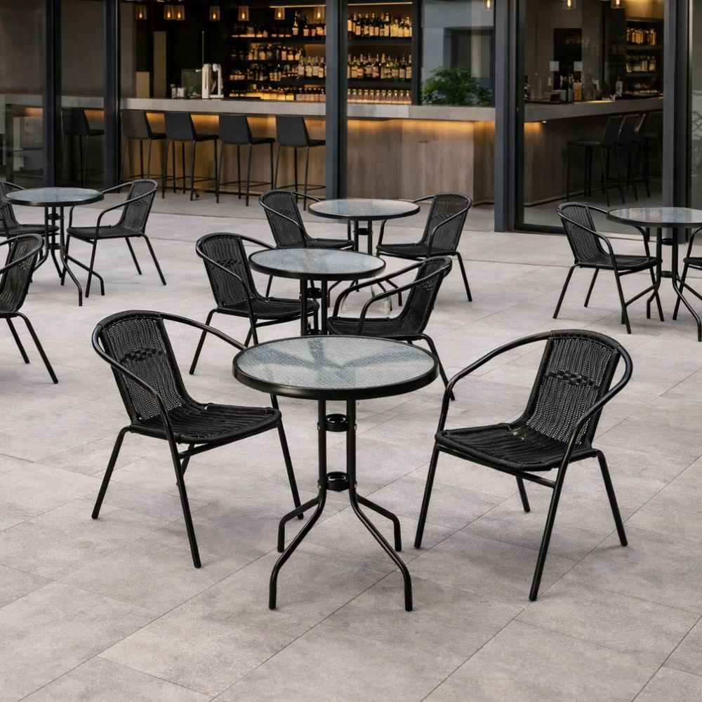 Set tavolo e sedie da esterno ideale per balcone, terrazzo, giardino o ambienti indoor; il design bistrot moderno rende questi mobili perfetti per l’uso domestico o contract presso bar, b&b, dehors…